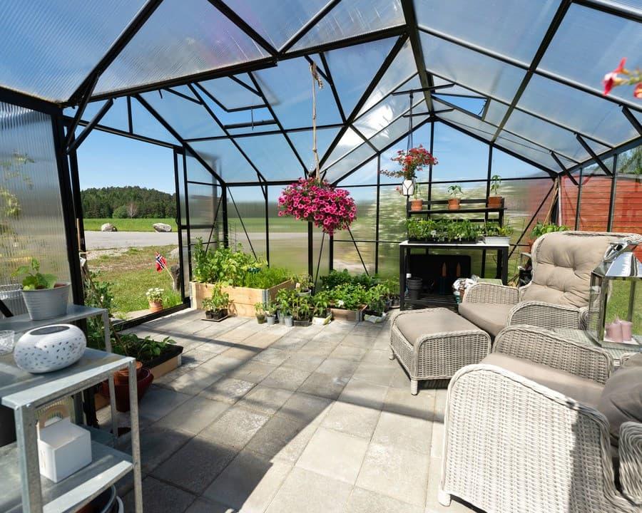 Sirius sitt orangeri på 13 kvadratmeter er til deg som ønsker å virkelig investere i et drivhus som har både kvalitet og stil. I dette drivhuset kan du dyrke frem planter og grønnsaker, og du kan innrede din egen koselige hagestue i et og samme drivhus. Orangeriet har god takhøyde, gode ventilasjonsmuligheter og et bredt inngangsparti med doble skyvedører. Med 13 kvadratmeter drivhus har du god plass til å både slappe av og dyrke planter. Sirius Orangeri leveres med fire takvinduer, stålsokkel, 3mm herdet glass i både tak og vegger, tre takrenner og fire luftevinduer i taket. Spesifikasjoner: Mål: 257 x 384 cm Inngang: 257 x 126 cm Sidehøyde 157 cm Mønehøyde: 252 cm Areal: 13 kvm Ventilasjon: 4 vinduer i taket Dør: Dobbel skyvedør